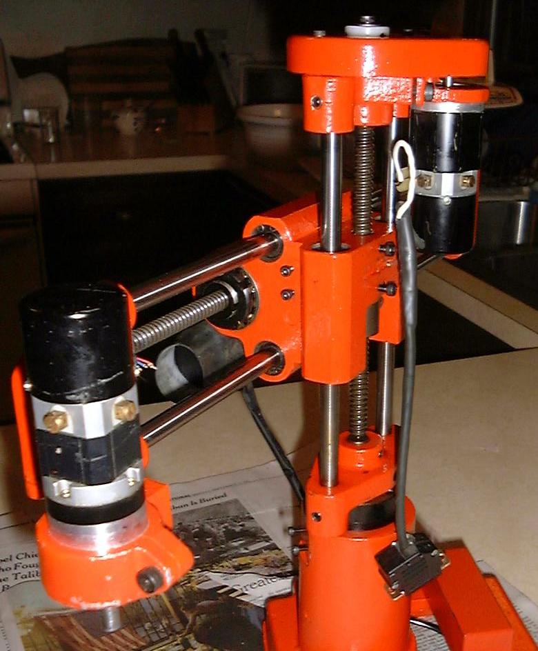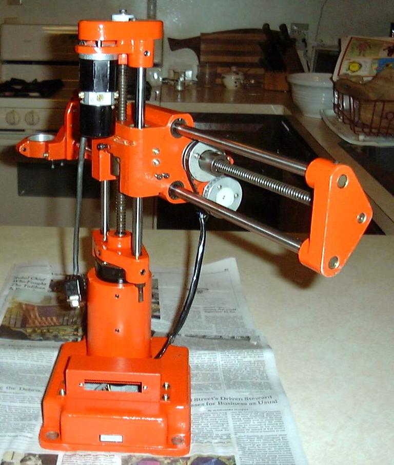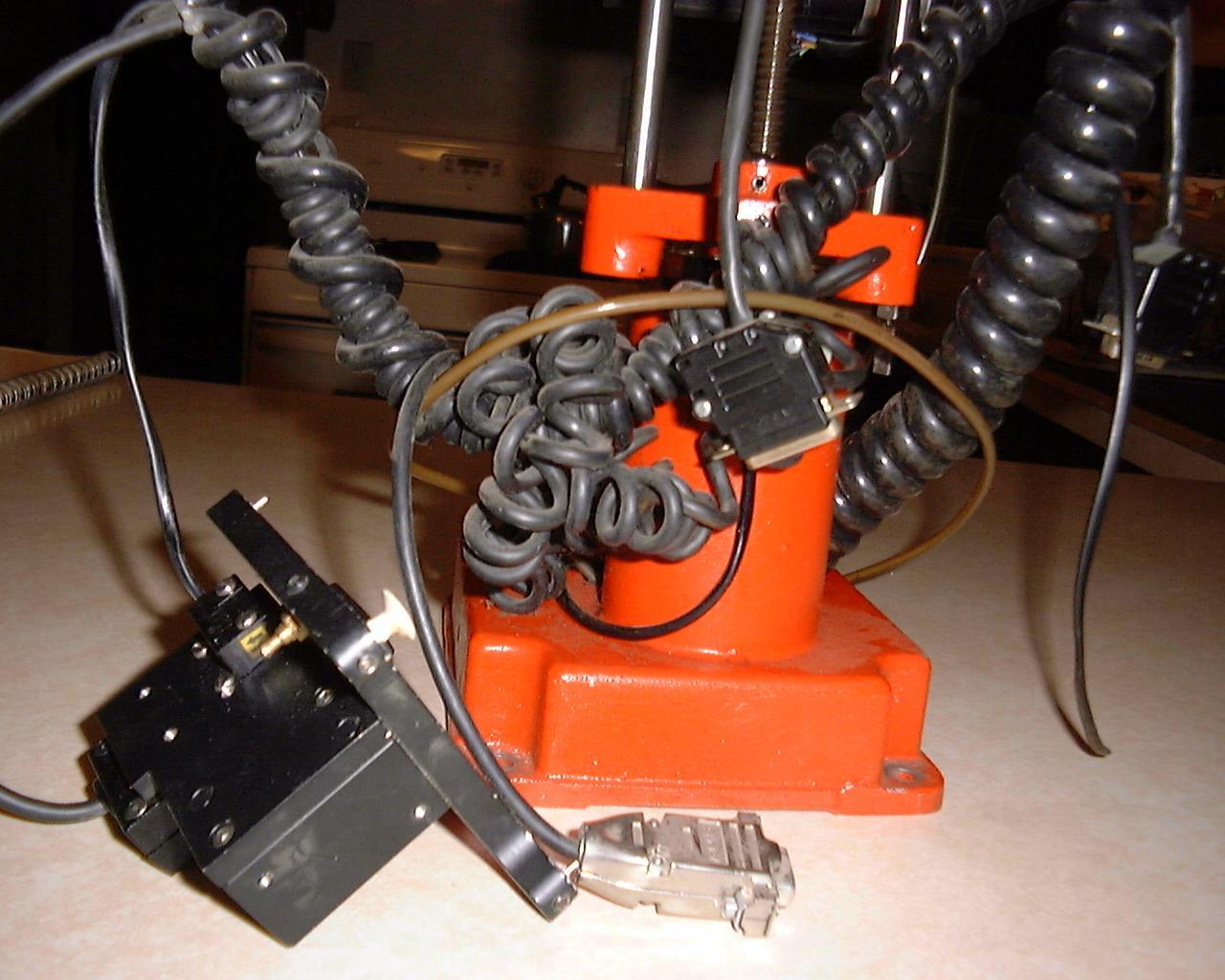At the last Science Museum meeting, Bruce Shapiro and I talked about getting an old pick and place robot he has working again. It is a 4-Axis small robot that uses DC servo motors and optical encoders. He doesn't have the controller for it, so he and another guy started building a 4-Channel PID servo controller using JR Kerr PIC-SERVO chips. The guy wired up one channel, and has parts for another channel, but things get pretty spendy quickly, and I guess Bruce didn't want to tak eon the job himself when his buddy stopped working on the project due to lack of time.