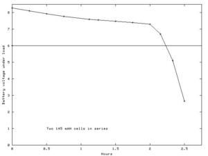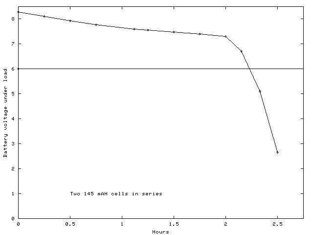 The discharge curve for two 145 mAH LiPoly cells in series running the processor and two motors.